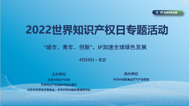4月25日下午,2022年世界知識(shí)產(chǎn)權(quán)日“城市、青年、創(chuàng)新”,IP加速全球綠色發(fā)展專題活動(dòng)成功舉辦?;顒?dòng)由北京市知識(shí)產(chǎn)權(quán)局、北京市科學(xué)技術(shù)委員會(huì)、中關(guān)村科技園區(qū)管理委員會(huì)聯(lián)合世界知識(shí)產(chǎn)權(quán)組織中國(guó)辦事處舉辦,世界知識(shí)產(chǎn)權(quán)組織WIPO GREEN項(xiàng)目在華戰(zhàn)略合作伙伴中關(guān)村創(chuàng)藍(lán)清潔空氣產(chǎn)業(yè)聯(lián)盟承辦本次活動(dòng)。