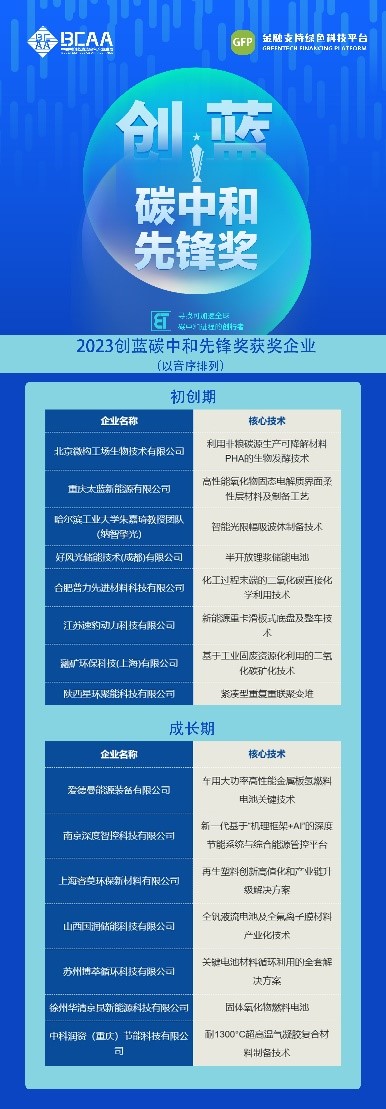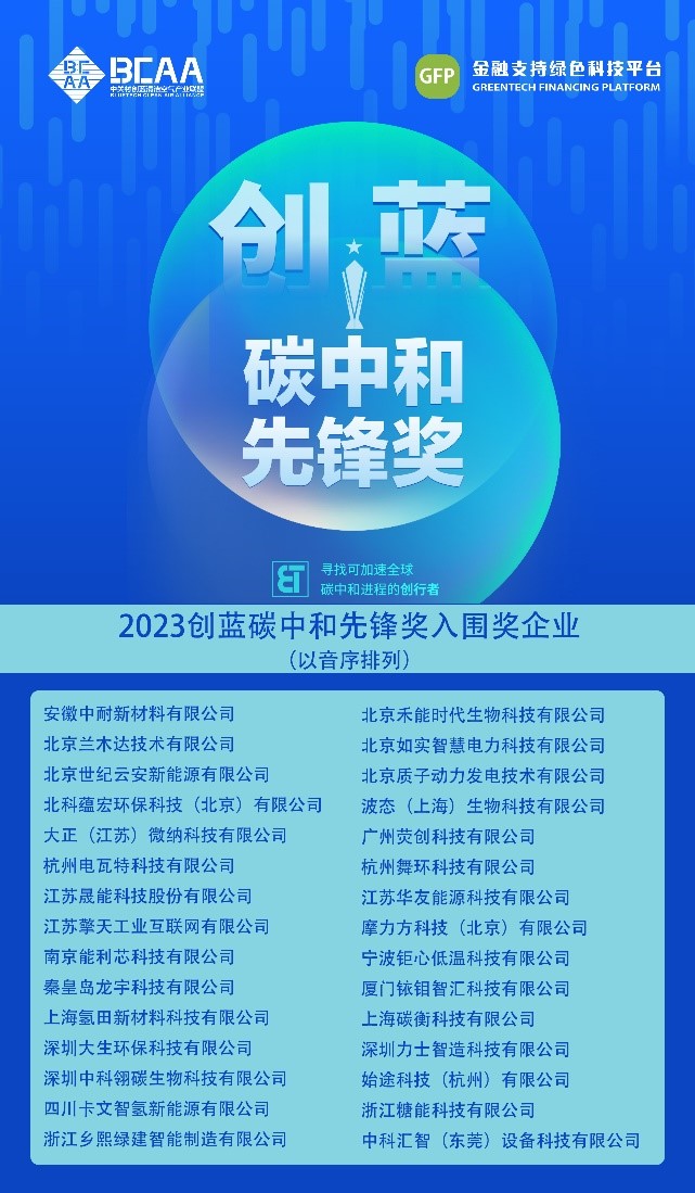 11月11日,中關村創藍清潔空氣產業聯盟(創藍聯盟)在第三屆金融支持綠色科技論壇上發布了2023創藍碳中和先鋒獎獲獎企業及入圍企業,并在北京國際財富中心為創藍企業舉辦了頒獎典禮。