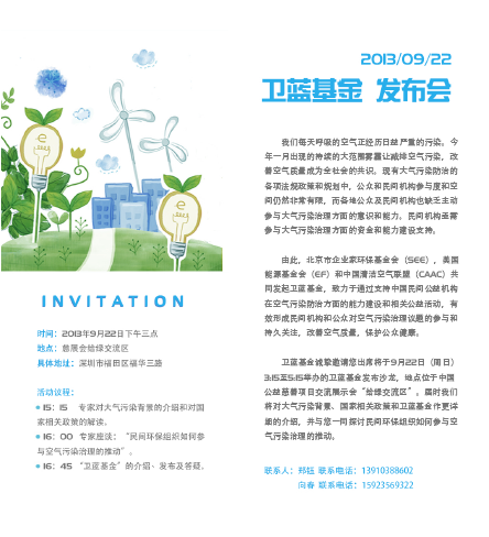 由此,北京市企業家環保基金會(SEE),美國能源基金會(EF)和中國清潔空氣聯盟(CAAC)共同發起衛藍基金,致力于通過支持中國民間公益機構在空氣污染防治方面的能力建設和相關公益活動,有效形成民間機構和公眾對空氣污染治理議題的參與和持久關注,改善空氣質量,保護公眾健康。