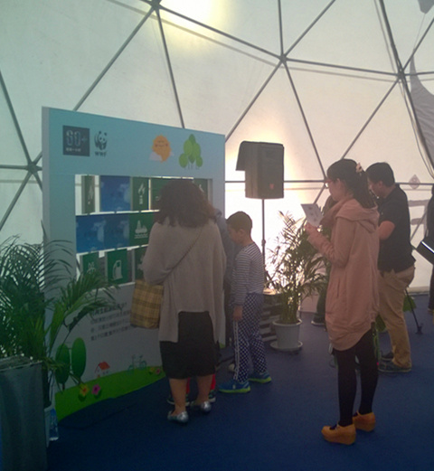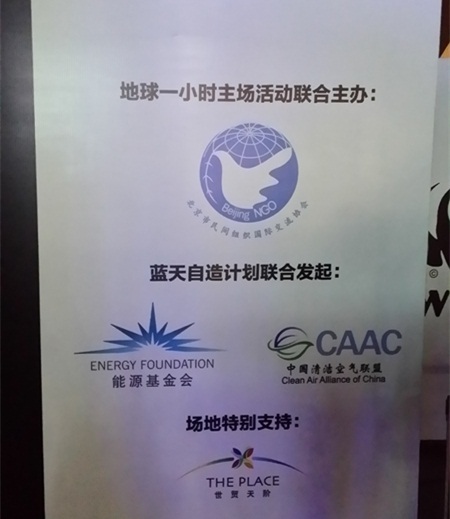 2014年3月29日,由中國清潔空氣聯盟和能源基金會共同參與支持的“WWF地球一小時-藍天自造”的在地活動成功舉辦。在北京世貿天階的主場活動中,一個巨大的智能氧泡帳篷內從健康防護、綠色出行、能源轉型三個維度展示藍天自造的方案和裝置,有來自協和醫學院、公眾環境研究中心等單位和機構的專家現場開講,介紹霧霾與健康、霧霾起源與防治等內容;此外,還有環保app體驗,定制防霧霾口罩以及生物發電體驗等多項活動,很多市民參與了現場的活動。
