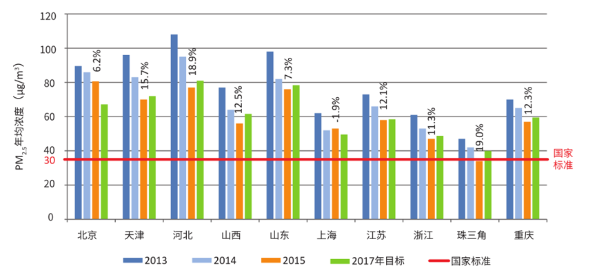 2015年顆粒物污染總體改善,10個(gè)省(市)/地區(qū)PM2.5年均濃度相比2014年平均降幅達(dá)11.34%,其中珠三角、天津、河北、山東、山西、江蘇、浙江、重慶均提前達(dá)到了《大氣十條》的2017年下降目標(biāo)。顆粒物超標(biāo)情況仍然突出,PM2.5污染最嚴(yán)重的區(qū)域?yàn)楸本⑻旖颉⒑颖蹦喜俊⑸綎|非臨海地區(qū)及河南組成的一大范圍區(qū)域,而珠三角地區(qū)則已經(jīng)達(dá)標(biāo)。以PM10(可吸入顆粒物)年均濃度下降為目標(biāo)的省(市)中,河南、寧夏、陜西、吉林、遼寧、湖北、甘肅7個(gè)省(市) 2015年P(guān)M10年均濃度相比2013年不降反升。