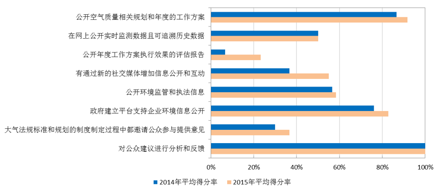 信息公開:公開年度工作方案執(zhí)行效果的省市明顯增多,超半數(shù)的省市主動(dòng)通過新媒體進(jìn)行信息公開與互動(dòng),不過省市在公開歷史可追溯空氣質(zhì)量數(shù)據(jù)方面進(jìn)展緩慢。